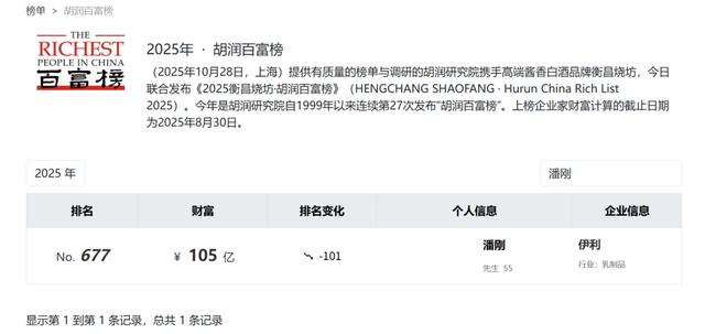 2025年胡润百富榜中,潘刚以105亿个人财富,排在第677位。