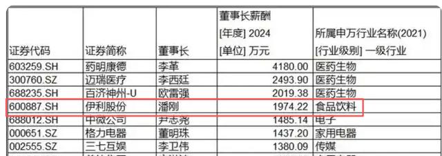 其中,伊利股份董事长潘刚以1974.22万元的年薪位列全行业第四,仅次于医药生物领域的三巨头(药明康德、迈瑞医疗、百济神州-U),成为食品饮料行业唯一跻身“千万级年薪俱乐部”的掌门人。