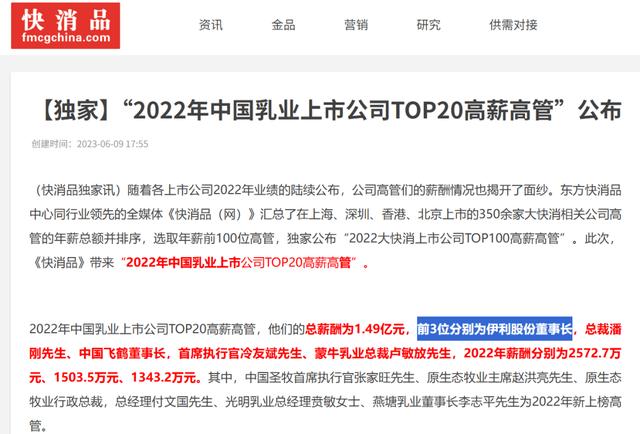 在“2022年中国乳业上市公司TOP20高薪高管”榜单中,潘刚毫无悬念地排名第一。