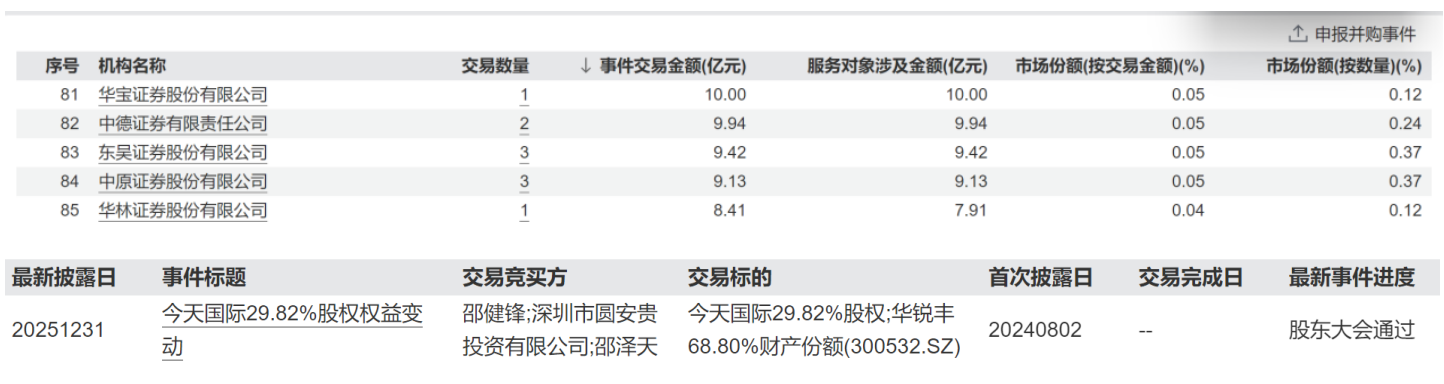 但数据显示,2024年以来,华林证券以独立财务顾问参与的并购业务仅有一例,涉及今天国际(300532.SZ)控股股东股份转让构成的管理层收购事项,业务所占有的市场份额不足1%。从交易数量和市场份额来看,财务顾问业务的行业竞争力尚未有效形成,在业务的开拓和增收方面,仍有较大的提升空间。