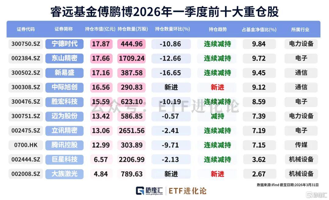 相较2025年末,一季度中际旭创、大族激光新进傅鹏博前十大重仓股,阿里巴巴-W、寒武纪退出退出十大重仓股;二季度减持宁德时代、东山精密、新易盛、胜宏科技、迈为股份、立讯精密、腾讯控股、巨星科技等公司。