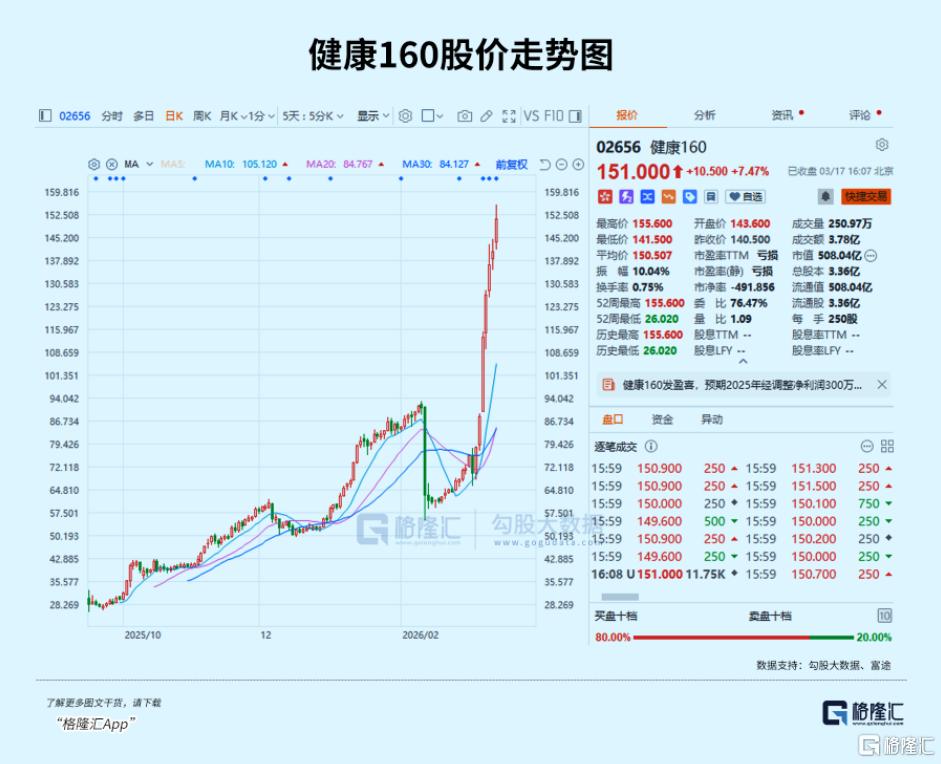 在此浪潮下,近日健康160股价连续7天暴涨,股价直接翻倍。更让人震惊的是,该公司当前股价151.0港元,自2025年9月上市以来(发行价11.89港元/股),仅半年时间就飙升高达11.7倍!