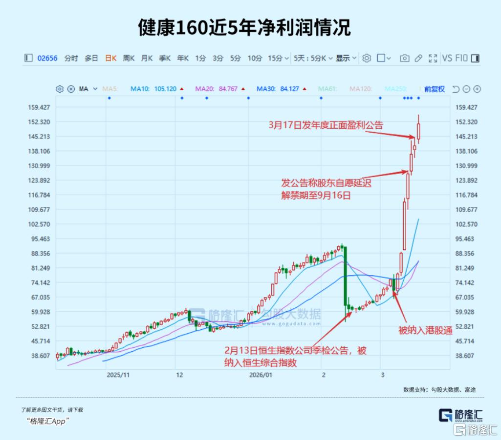 值得一提的是,2026年2月13日,恒生指数公司公布季度检讨结果,健康160被纳入恒生综合指数,然后次日起,该公司股价止跌回涨,并随着3月6日沪深交易所正式发布港股通标的调整公告,其股价开启非常强势的连续大涨行情。