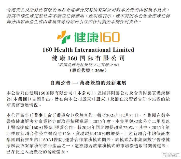 截至2025年底,健康160已与82家公立二甲及以上医院达成“160AI医院”运营合作,仅第四季度就新增52家,环比增长420%。