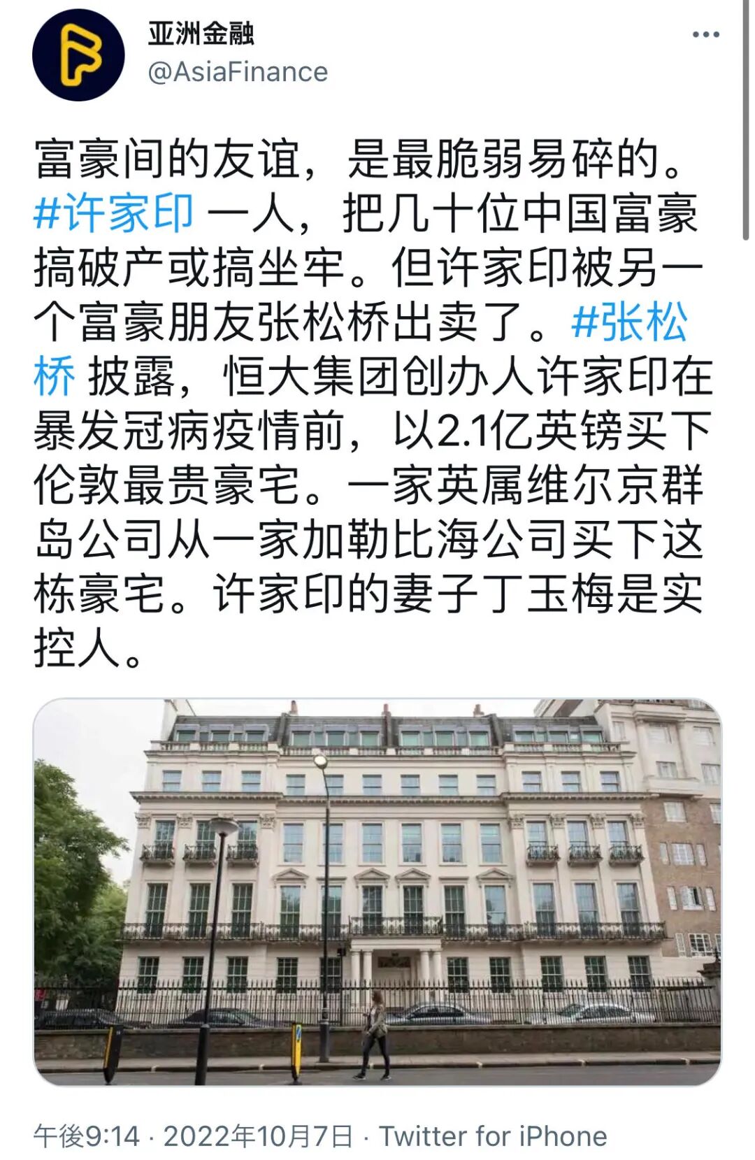 江湖还有传闻,许老板疫情前20亿买下伦敦最贵豪宅,请张松桥代持,最终被爆,正是好兄弟张松桥走漏了风声。