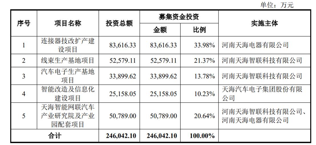 天海电子本次IPO预计募集资金金额约24.6亿元,募集资金投向“连接器技改扩产建设项目”“线束生产基地项目”“汽车电子生产基地项目”“智能改造及信息化建设项目”和“天海智能网联汽车产业研究院及产业园配套项目”。然而,这些募投项目的前景并不乐观,资金使用效率存在疑问。