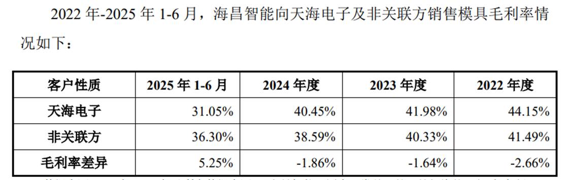 报告期各期,天海电子向海昌智能采购的主要设备及备件、模具及备件金额分别为:1.69亿元、1.57亿元、1.55亿元及1.04亿元,占向海昌智能采购金额的比例分别为85.33%、85.57%、86.25%及 81.59%。而海昌智能卖给天海电子的设备毛利率,与卖给其他非关联客户的毛利率,差异波动不定,时正时负。更微妙的是,在一些可比设备的采购价格对比中,天海电子从关联方采购的价格时而显著低于第三方,时而却又高于第三方。天海电子对此的解释多为“配置不同”、“定制化需求”。诚然,设备配置存在差异,但这种定价的波动与差异,是否给利润调节留下了过于灵活的操作空间?