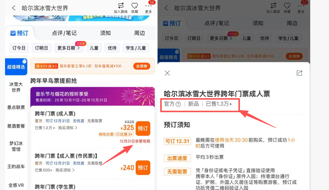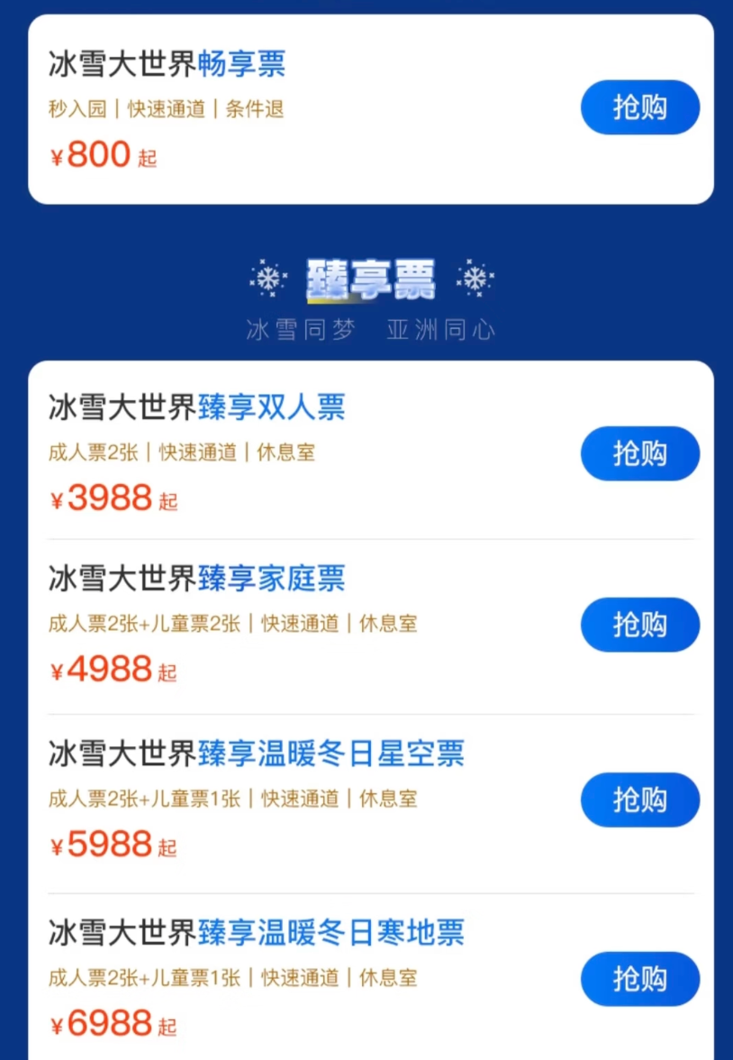 对于动辄每日接待上万人的冰雪大世界而言,不少游客为提升游玩体验而选择VIP快速通道,这也使得此类门票供应相对紧张。