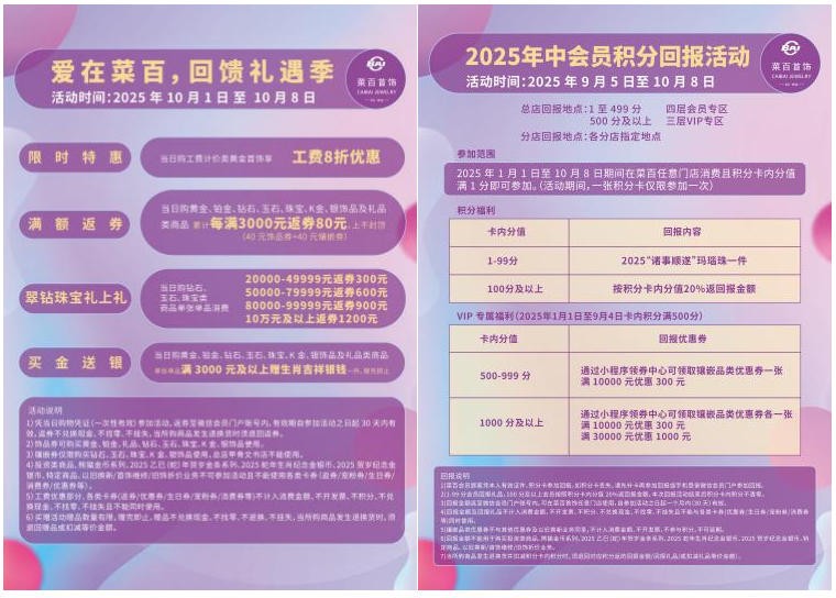 除了体验升级外,更为广大消费者提供了实实在在的优惠福利。“爱在菜百,回馈礼遇季”主题活动持续加码,2025年中会员积分回报活动火热进行,此外,更有“西城消费券”助力消费升级、感恩回馈。