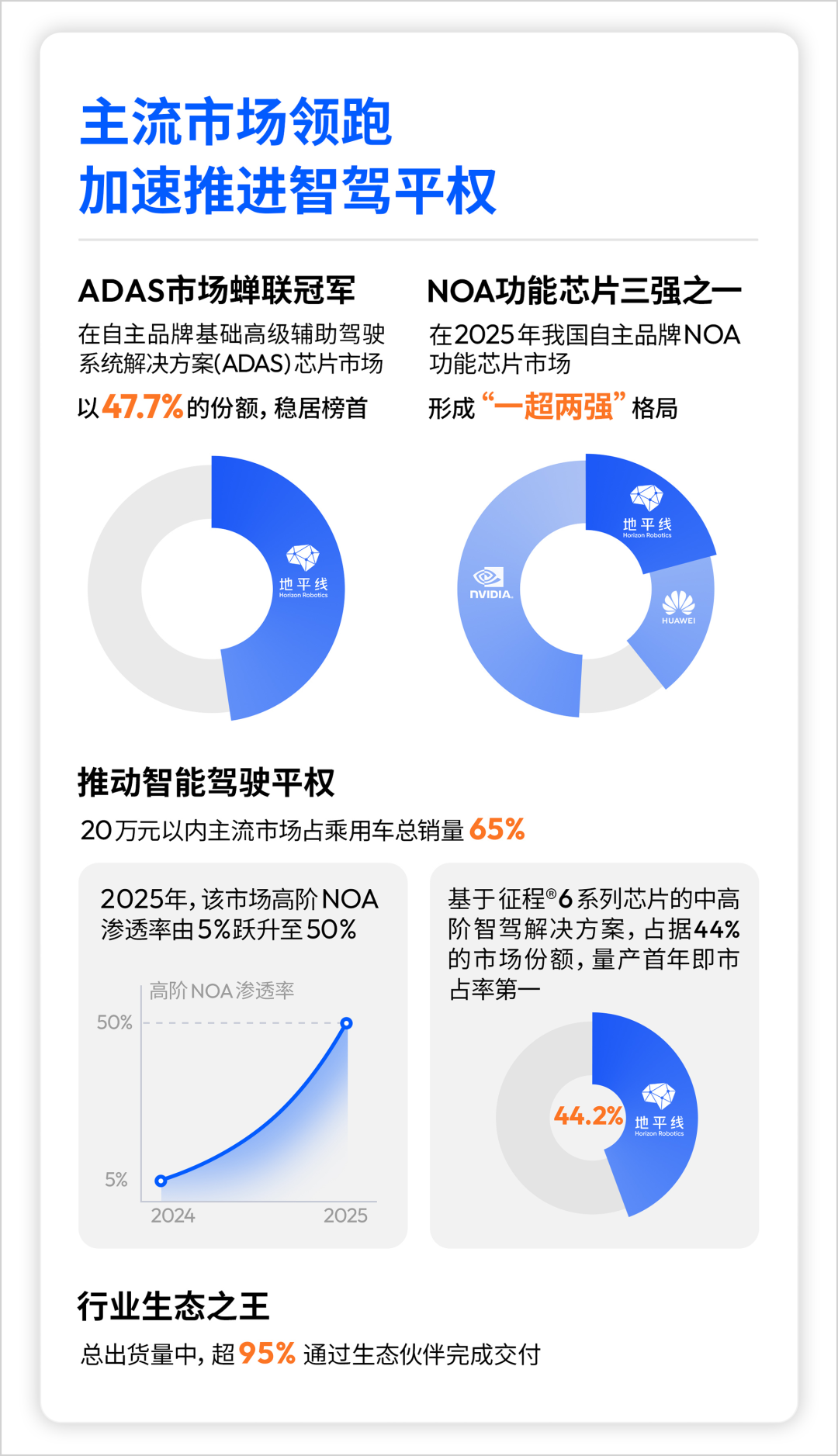 2025年,恰恰是在这个价格区间,中国自主品牌的中高阶智驾迎来了大爆发,智能车销量占比从年初的5%,急速上升到年底的50%以上,实现10倍速增长。就在这一变化最剧烈、增长最迅猛的主流市场,地平线基于全新一代征程6系列芯片的中高阶智驾解决方案,一举拿下了44%的市场份额,量产首年即市占率第一,坐稳了“国民智驾王者”的宝座。
