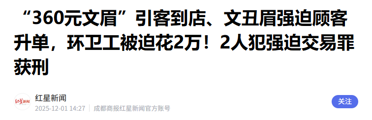 一个美容门店,先以“360元特价文眉”把消费者吸引到店,再通过强迫服务、暴力或软暴力等方式让消费者升级套餐至数千元甚至数万元,涉案金额超75万元,法院查明的被害人多达38人。