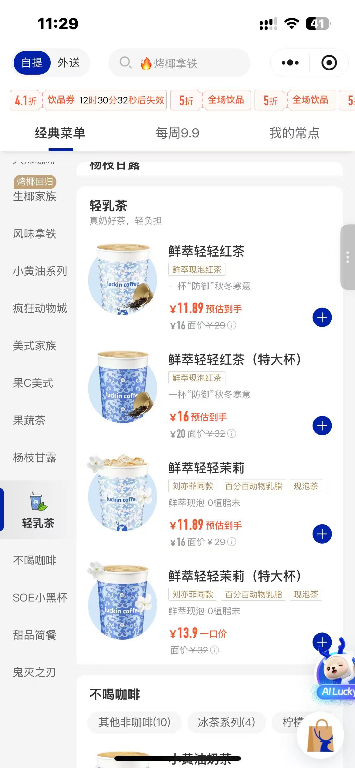 而这场“跨界”并不是单向的,瑞幸、库迪这样的现磨咖啡品牌的菜单中,奶茶、果茶、轻乳茶等花样繁多的非咖饮品越来越多。