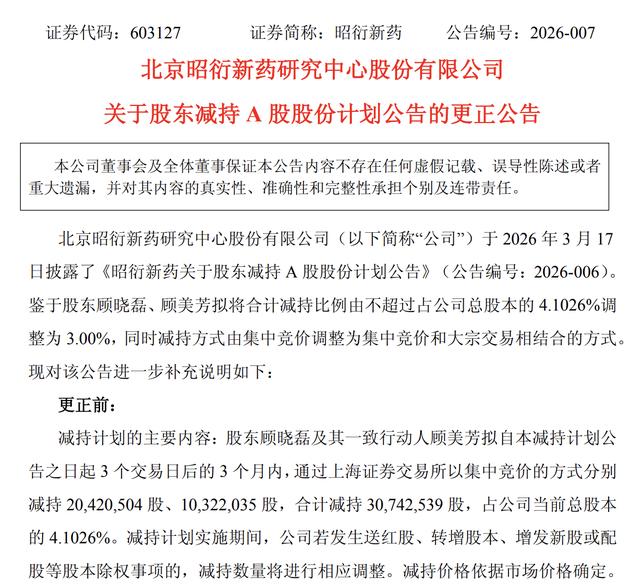 股价大跌后,昭衍新药紧急发布更正公告,相关股东减持比例有所收缩。更正后,顾晓磊、顾美芳拟将合计减持比例由不超过占公司总股本的4.1026%调整为3.00%,同时减持方式由集中竞价调整为集中竞价和大宗交易相结合的方式。