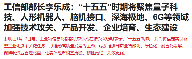 工信部部长李乐成:“十五五”时期将聚焦量子科技、人形机器人、脑机接口、深海极地、6G等领域,加强技术攻关、产品开发、企业培育、生态建设