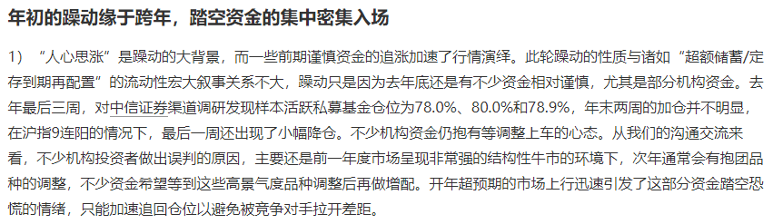 很多机构去年年度减仓了、准备等开年大盘调整再上车,但谁知道年初增量资金强劲指数继续连阳,这里机构就慌了被迫追回来了,另外去年的赚钱效应、和年初指数的连阳强势信号,又吸引了更多的资金进场。