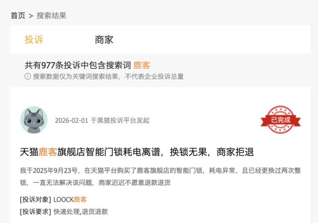 然而,市场领先和技术积累并不意味着鹿客的产品毫无瑕疵。在黑猫投诉平台上,以鹿客为关键词的投诉已达977条,投诉内容涵盖产品质量缺陷、售后服务差、虚假宣传等多个方面。比如,一位消费者在2025年9月23日购买的门锁耗电异常,虽然更换了两次门锁,但问题迟迟未能解决,商家也不愿意为消费者退货退款;此前,第一家电也报道过鹿客鹿客智能门锁因质量、售后问题被消费者投诉。