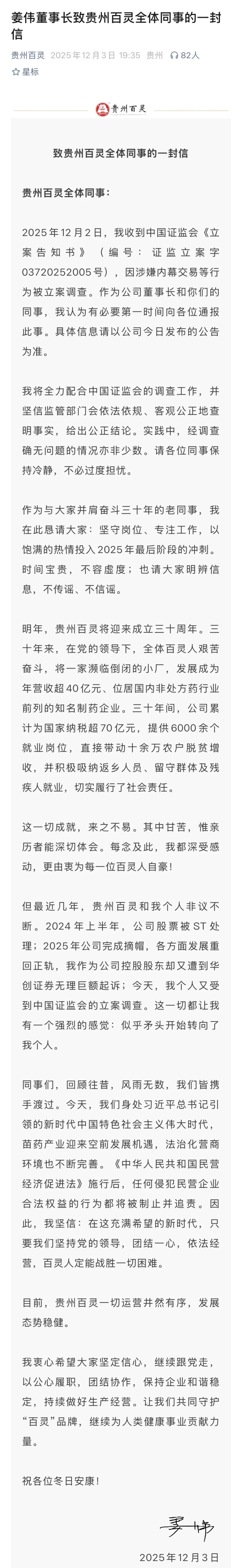 公司公告发出后,姜伟还通过贵州百灵微信公众号发布全员信,试图稳住内部士气。