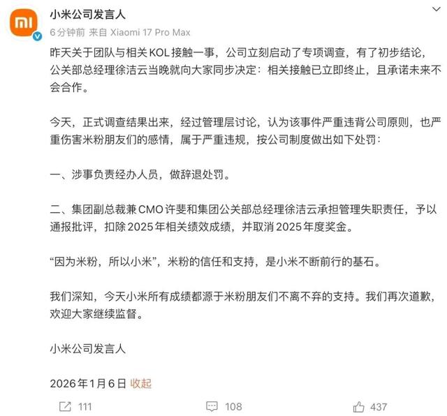 眼看怒火燎原,雷军这次真生气了:1 月 6 日 22:55,官方通报——涉事员工直接走人,集团 CMO 许斐、公关一把手徐洁云通报批评、扣绩效、年终奖,一场内部处刑才勉强按下暂停键