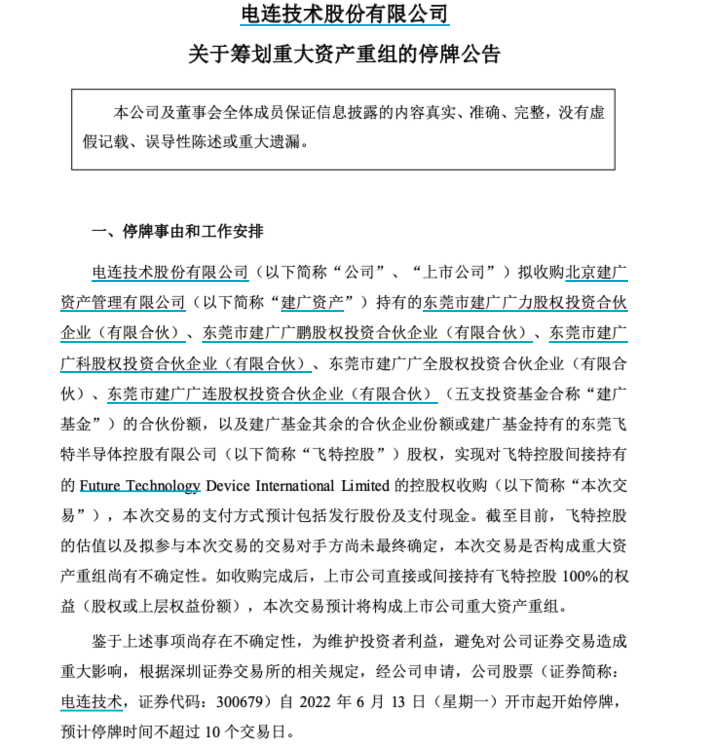 记者查询发现,根据Wind和巨潮资讯信息,2022年6月13日当日,市场仅有电连技术(300679.SZ)发布《关于筹划重大资产重组的停牌公告》。