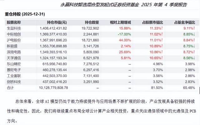 比如,永赢科技智选混合型发起式证券投资基金,2025年4季报已发布。这是一只重仓AI硬件的主题基金,也是去年的权益投资冠军。想搭人工智能便车的基民,最好先去看看其第四季度持仓,了解一下基金经理任桀的最新投资策略,然后再考虑要不要买进。