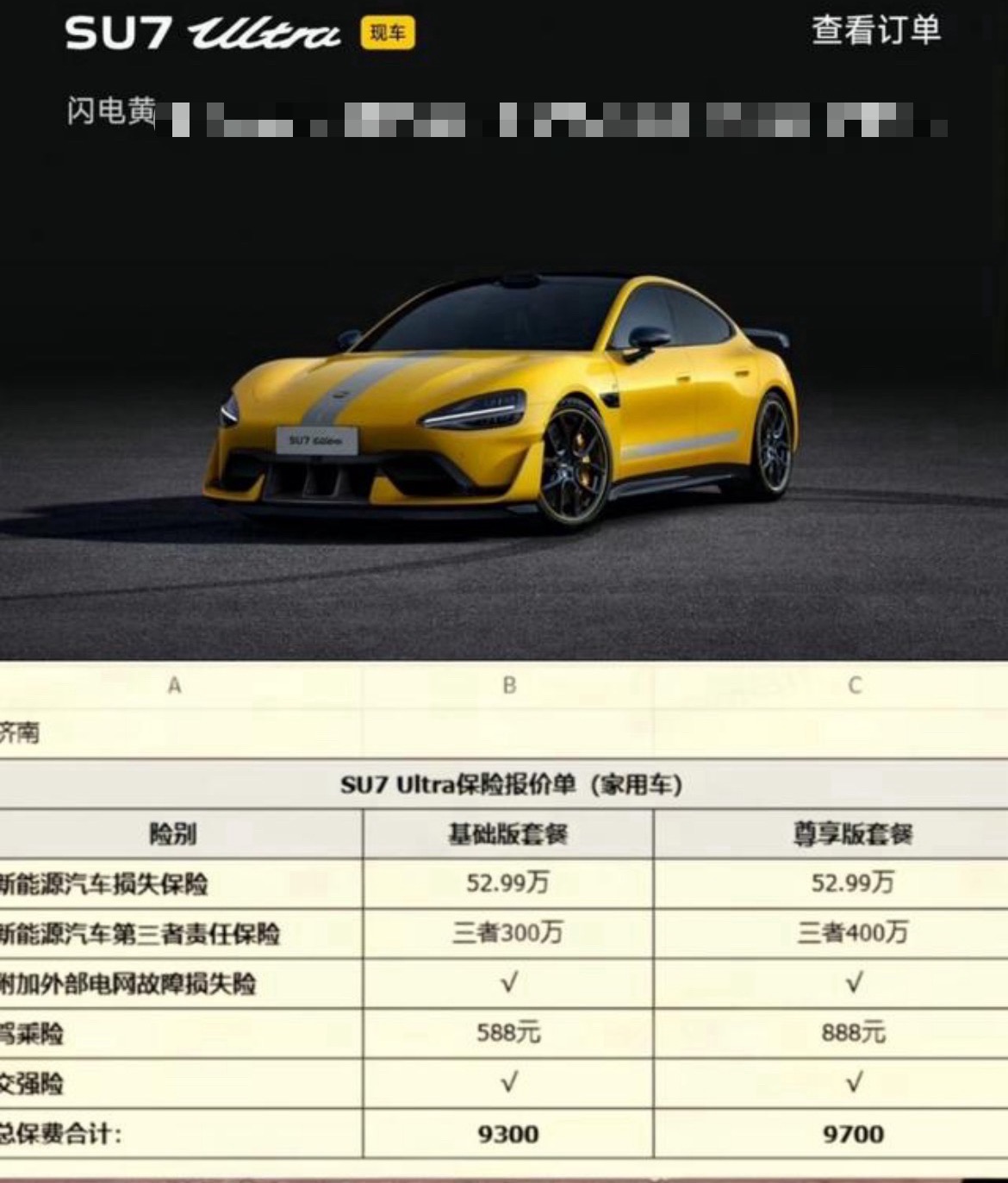 时代财经了解到,小米汽车合作的险企包括中国人保、中国平安、太平洋保险和阳光保险等。它们为用户提供了基础版和尊享版两种保险方案,两种方案下小米SU7 Ultra的首年保费相差约400元。