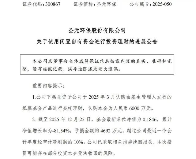 12月26日,圣元环保发布公告称,公司全资子公司厦门金陵基建筑工程有限公司于2025年3月认购私募基金产品,认购本金6000万元。