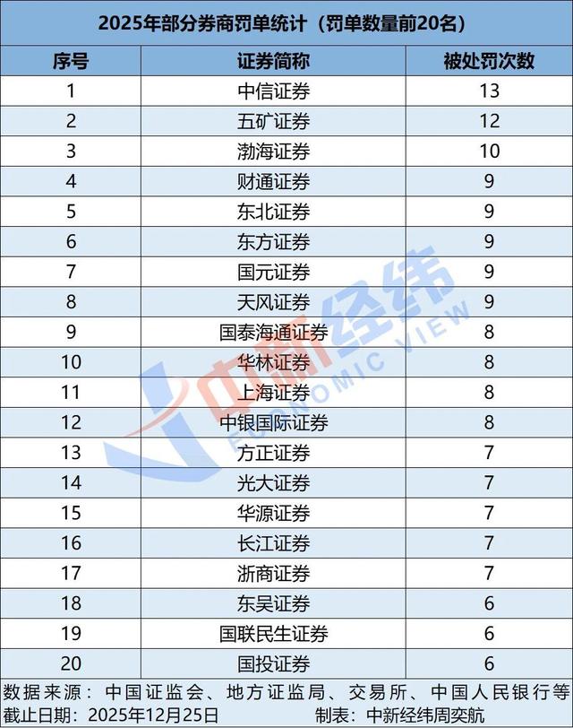 数据不会撒谎。据中新经纬统计,2025年至今(12月25日),监管部门累计开出了329张罚单,涉及77家券商。