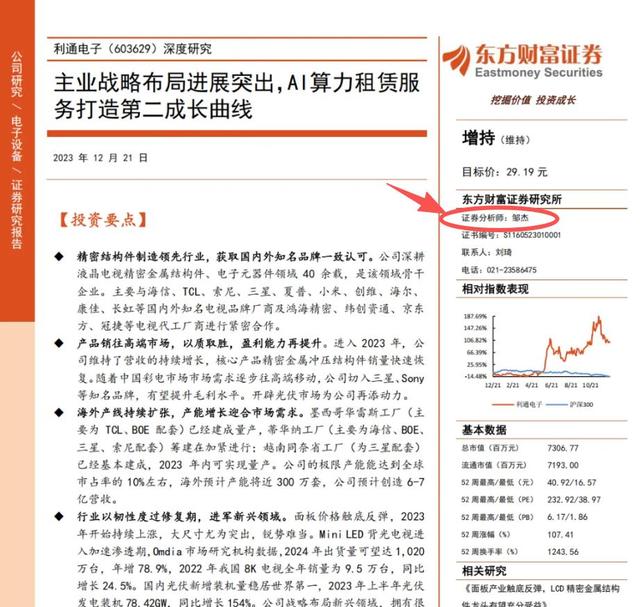 2023年4月,东方财富证券曾发布题为《面板产业触底反弹,LCD精密金属结构件龙头有望充分受益》的研究报告,对利通电子2022年年报进行点评。2023年12月,东方财富证券再次发布关于利通电子的深度研报《主业战略布局进展突出,AI算力租赁服务打造第二成长曲线》。