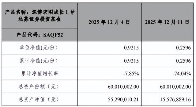 根据公告披露的数据显示,该基金截至2025年12月4日的净值为0.9215元。截至2025年12月11日,基金单位净值暴跌至0.2596元,累计亏损74.04%。