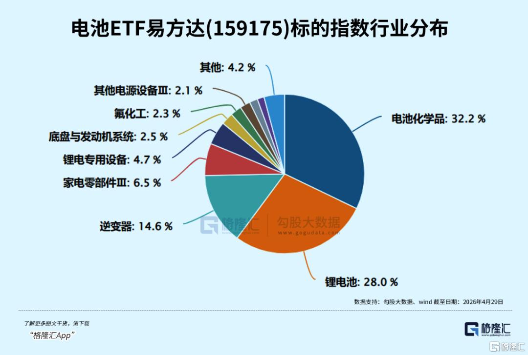 电池ETF易方达(159175)跟踪中证电池主题指数,覆盖动力电池、储能电池、消费电子电池及相关产业链上下游环节,聚焦上游关键材料与中游电池制造,其中电池化学品+锂电池合计占比60.2%,权重股包括宁德时代、阳光电源、三花智控亿纬锂能天赐材料等行业龙头,其综合费率0.2%/年,为同类最低。