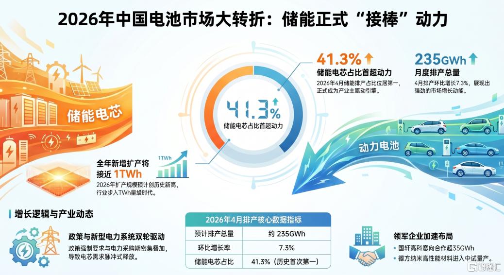 而在生产端,大东时代智库(TD)追踪数据显示,2026年4月中国锂电市场预计排产总量约235GWh,环比增长7.3%,其中储能电芯排产占比达41.3%,首次超过动力电池成为第一大需求来源。