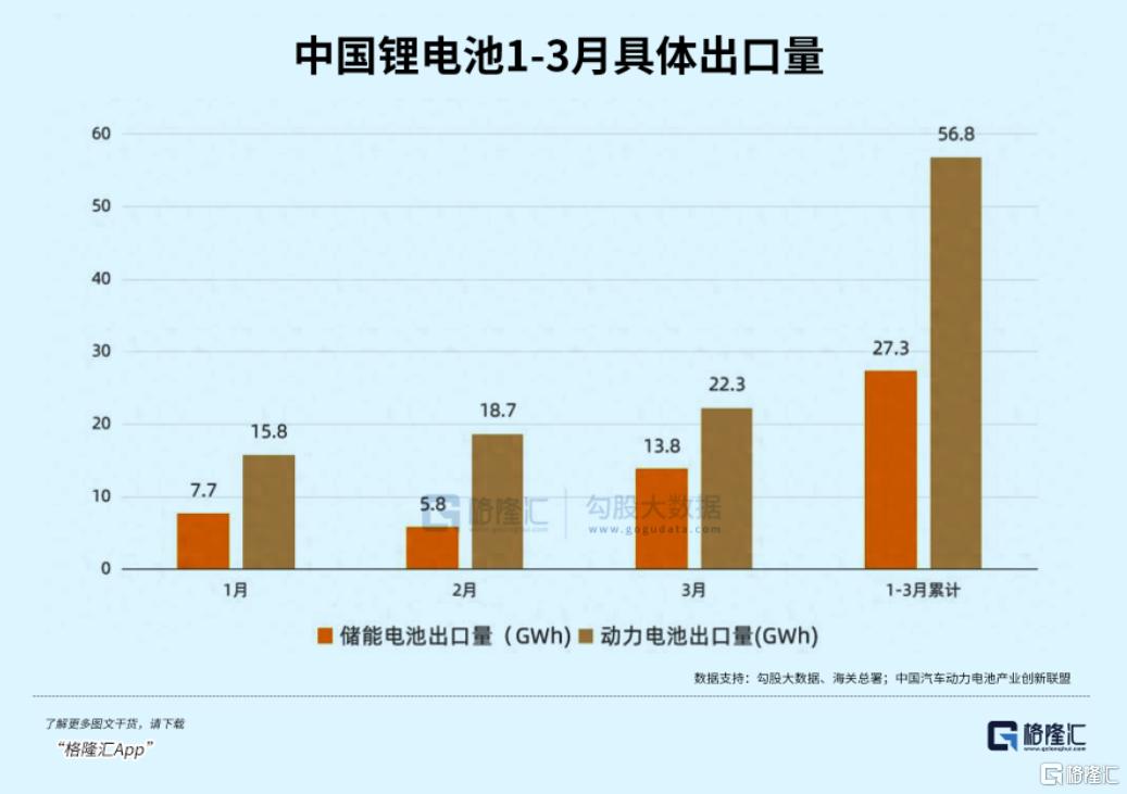 海关总署及相关数据显示,2026年一季度中国储能产业链出口总额达到81.1亿美元,同比增长71.8%。具体到货量,一季度储能电池累计出口量达27.3GWh,同比增长15.0%,其中3月份单月出口量为13.8GWh,实现环比增长96.9%、同比增长52.4%。