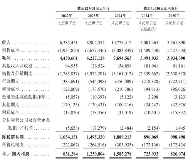 2022年至2024年,珀莱雅分别实现收入63.85亿元、89.05亿元和107.78亿元,其中2024年收入突破百亿元,成为国内首个实现百亿销售收入的化妆品集团;净利润分别为8.31亿元、12.31亿元和15.85亿元,亦保持稳定增长态势。