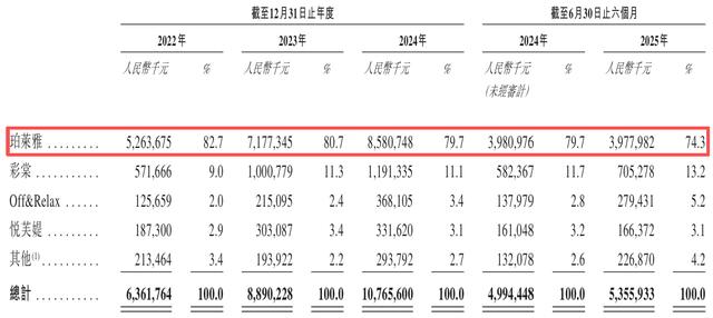 珀莱雅的2025年之所以过得如此坎坷,与其核心品牌“珀莱雅”增长遇阻息息相关。透过招股书可知,该品牌在过去的三年中为公司贡献了近八成的收入,但2025年上半年的收入却同比微降0.08%,来到39.79亿元。