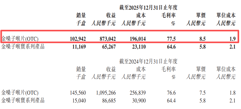 2025年,金嗓子喉片(OTC)的销售额约占整个集团收益总额高达92.6%,毛利率较2024年提高约一个百分点至77.5%,直接决定了整个金嗓子集团的收益。