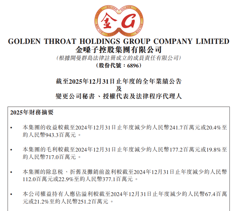 2025年,由于金嗓子喉片(OTC)的销售量下降,金嗓子集团来自这一块销售的收益约为人民币8.73亿元,较2024年的约人民币10.953亿元减少约人民币222.3百万元或20.3%,直接带崩了总收益和总净利润。