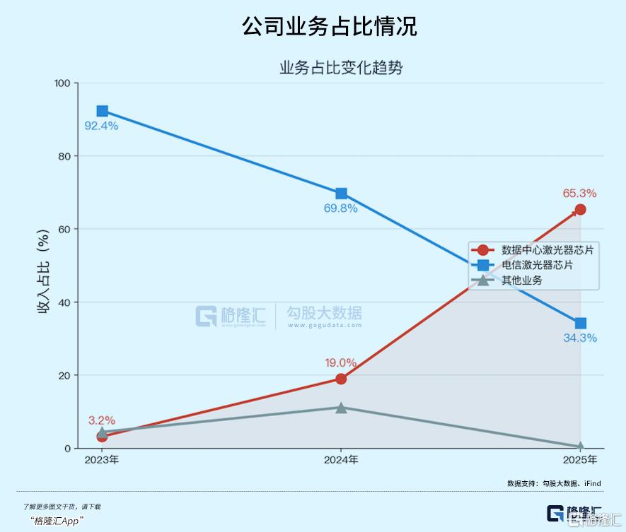 而今年,随着CW硅光光源(70mW)实现百万颗级出货,绑定中际旭创等头部客户,公司数据中心业务收入占比首次超过电信市场,达到51.04%,三季度整体毛利率回升至54.76%,成为公司增长的新引擎,成长幅度是相当大的。
