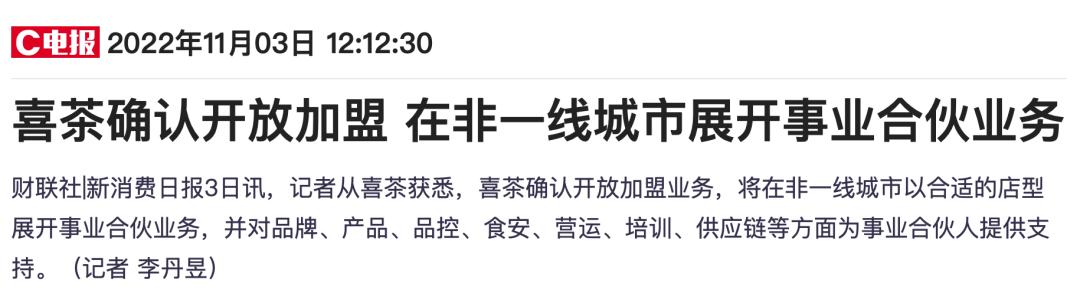 直到2022年11月,奶茶竞争白热化,其他品牌门店大幅扩张时,喜茶才开放了加盟。但喜茶给加盟商留出的,主要是非一线城市的市场。