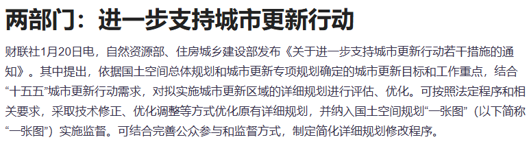 自然资源部、住房城乡建设部发布《关于进一步支持城市更新行动若干措施的通知》。其中提出,依据国土空间总体规划和城市更新专项规划确定的城市更新目标和工作重点,结合“十五五”城市更新行动需求,对拟实施城市更新区域的详细规划进行评估、优化。