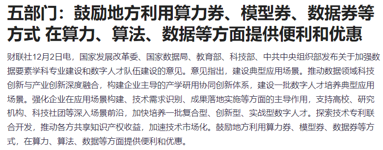 五部门:鼓励地方利用算力券、模型券、数据券等方式,在算力、算法、数据等方面提供便利和优惠。