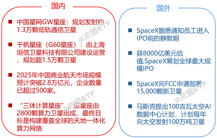 为什么这么夸张?因为放卫星、发射火箭的消息太密集了,产业格局可能超出我们想象。如上图,马斯克的Spacex估值8000亿,要发1.5万颗卫星,还有太空发电、太空数据中心。