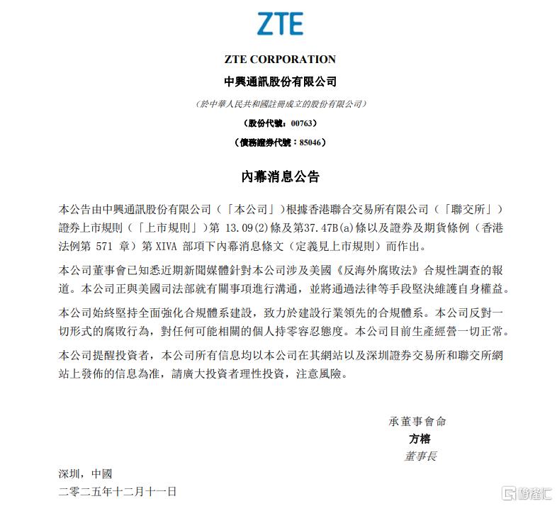 公司反对一切形式的腐败行为,对任何可能相关的个人持零容忍态度。同时,中兴通讯表示,公司目前生产经营一切正常。