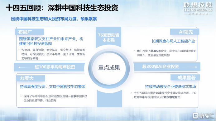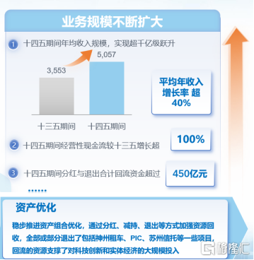 此外,公司的创投业务一直是二级市场比较稀缺的标的,这一次回顾来看,十四五的表现还是很出色的,每年投资100+的中国科技企业,十四五期间上市76家企业,IPO数量行业前三,主要分布在生物医药、AI产业链、新能源新材料领域。明星企业很多,比如摩尔线程、沐曦、海光等,表明公司的投资能力还是行业顶尖的。