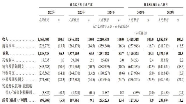 从具体财务表现来看,招股书显示,2022年至2024年,公司营收分别为16.67亿元、18.46亿元和22.11亿元,三年复合增长率超15%。更关键的是,Soul已实现从长期亏损到稳定盈利的转折,2023年盈利为3.61亿元,2024年盈利为3.37亿元,2025年前8个月已达2.86亿元。