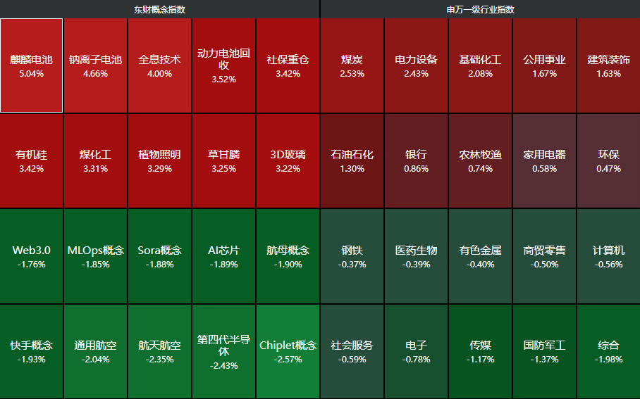 分行业来看,煤炭、电力设备、基础化工、公用事业、建筑装饰等行业领涨,综合、国防军工、传媒等行业领跌。