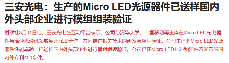 三安光电在互动平台表示,公司生产的Micro LED光源器件性能卓越,已送样国内外头部企业进行模组组装验证。公司已在Micro LED材料和器件方面布局国内外专利400余件。
