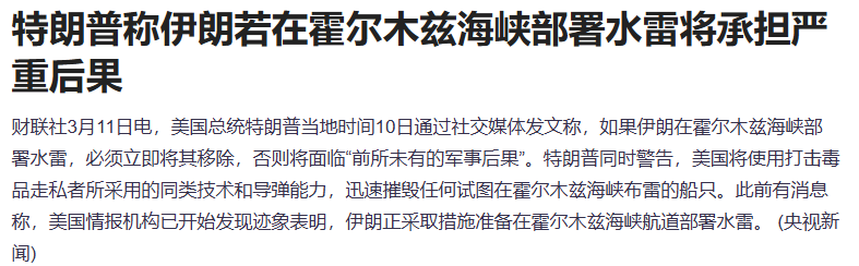 然后还有报道称伊朗已开始在霍尔木兹海峡布雷。目前布雷规模尚不大,近日仅布设了几十枚水雷。美国总统特朗普当地时间10日通过社交媒体发文称,如果伊朗在霍尔木兹海峡部署水雷,必须立即将其移除,否则将面临“前所未有的军事后果”。