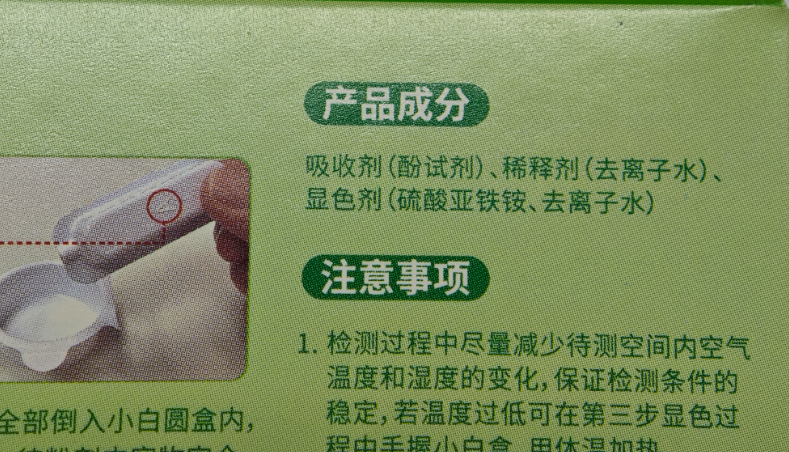甲醛自测盒产品成分通常包括吸收剂(酚试剂)、稀释剂(去离子水)、显色剂(硫酸亚铁铵、去离子水)。
