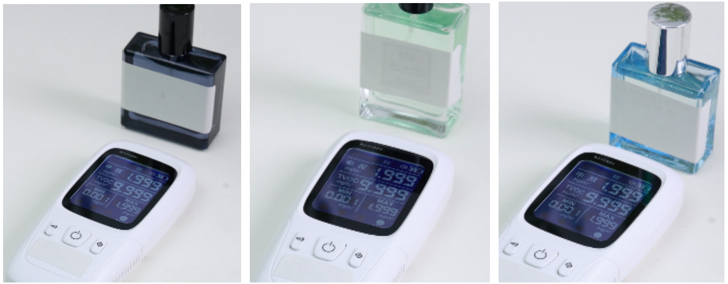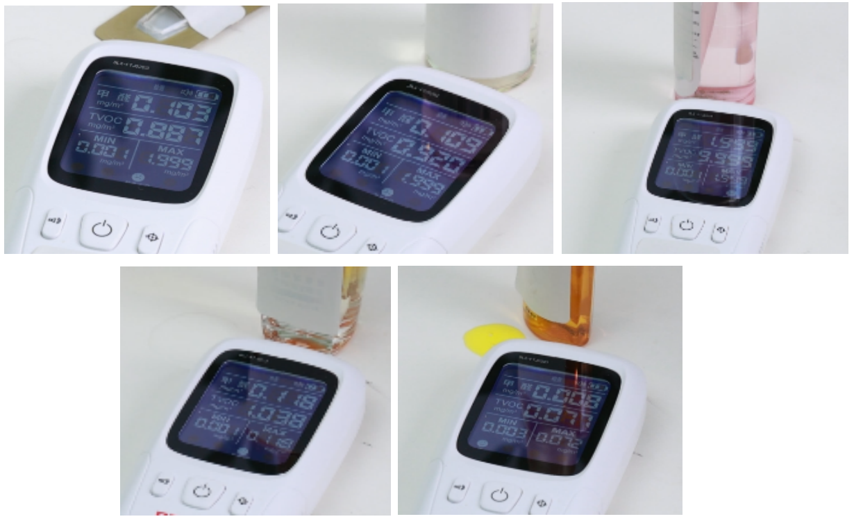 ▲用甲醛自测盒、甲醛检测仪测试,检出多款香水“甲醛超标”假象
