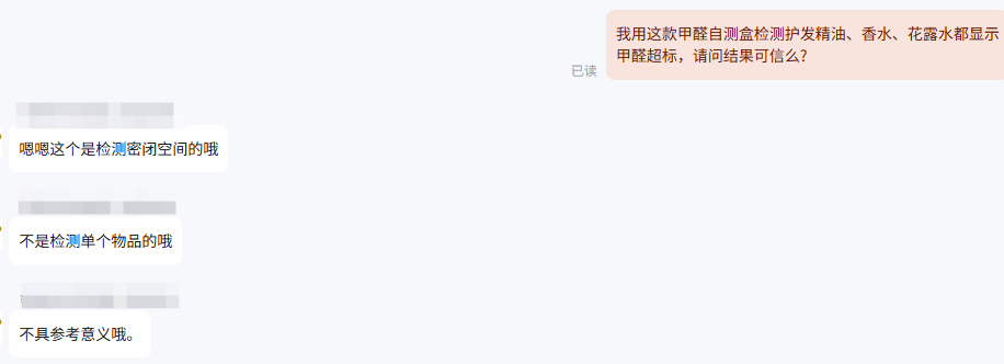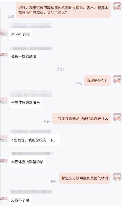 ▲甲醛检测仪客服反馈,结果不可信,会被干扰。